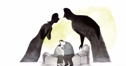 Oh my God this one broke me. I saw it on Netflix completely at random back when it first came out around November of last year. I was literally walking upstairs to the kitchen to get some water, and my roommates were in the living room scrolling. They saw that the film was short, so they decided to take a look. From the first frames, where a man and a woman sit on opposite ends of a long table lazily picking at food while pencil sketch-style shadows loom overhead, I was hooked enough to see where it went.
