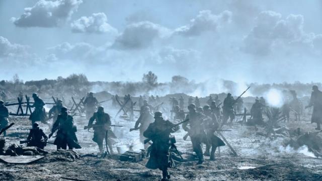 I complained yesterday that the Cinematography of this version of All Quiet was largely a ripoff of what Roger Deakins did in 1917, and when it comes to Visual Effects, we have the same thieving shenanigans. The film employs the exact same techniques used in that previous World War I epic, and several other war movies of the modern era before it. Battlefields are made to look bigger than the actual set thanks to green screens. Explosions in the distance create the illusion of devastation without having to use real pyrotechnics. The sky and weather are artificially created to set a mood and to cover up cranes and other production equipment visible in the frame (and also to make sure that when people like me bitch about it, we’re literally old men yelling at clouds). Flames made entirely of CGI engulf soldiers composited onto the screen long after the actor has left the shot. Blood spatters erupt from head and body wounds via computer because pop capsules are apparently a thing of the past.