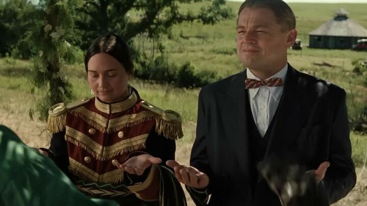 The use of costuming as a visual metaphor extends to Leonardo DiCaprio as Ernest. Initially depicted with a soft brim cap, overalls, and a dirty shirt and pants, Ernest’s wardrobe improves in cost and quality as his relationship with Mollie grows. By the time the plan is hatched to poison her, he’s dressed to the nines in three-piece suits and 10-gallon hats, a tradition that started when Mollie bought him his first one when they began dating. Fittingly, though (pun intended), the hats always look just a bit off on him. Ernest is the first major character that DiCaprio has played who is a fully-functional adult, but just awkward and dumb. His potentially willful ignorance of the plotting going on around him is just the most obvious example, but if you watch the film again, take a look at how the bigger hats sit on his head. They stay in place, but they never quite look right, like they’re just not made for his head. This, I feel, is intentional, a sly declaration that no matter how much he raises his station in life, he’s still a bungling fool.