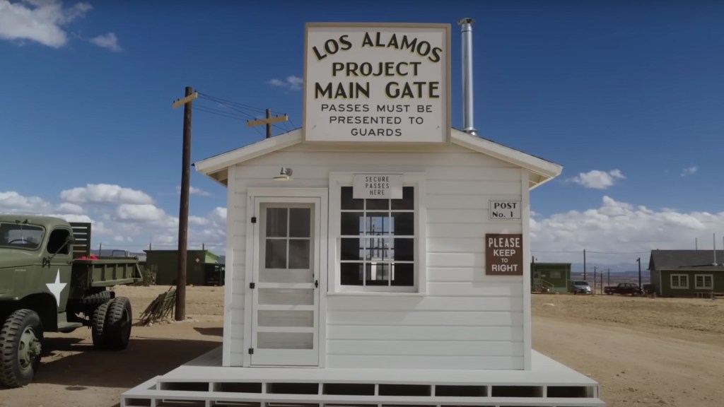 And I don’t want to discount what went on here, because the work is stellar. Not only is the desert town recreated, but the halls of Congress, the campuses of Cambridge, Göttingen, and Berkeley, and the White House. All of these facsimiles are impeccably constructed in a way that makes them feel almost interactive.