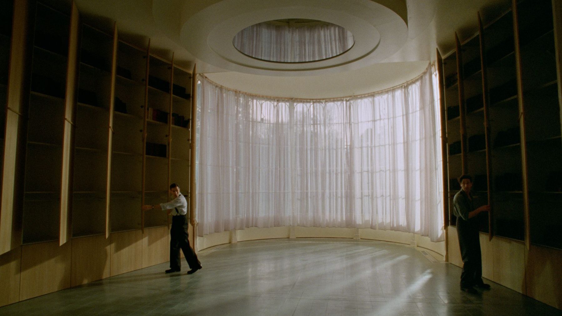 The motif extends from there, as a stark contrast is displayed between Harrison and László. The former’s estate is sprawling and garish, while the latter spends half the film sleeping in closets. Even when László’s wife arrives, their living quarters are either extremely Spartan or cramped with what meager belongings they can afford, while the Van Buren mansion almost delights in its lack of spatial economy.
