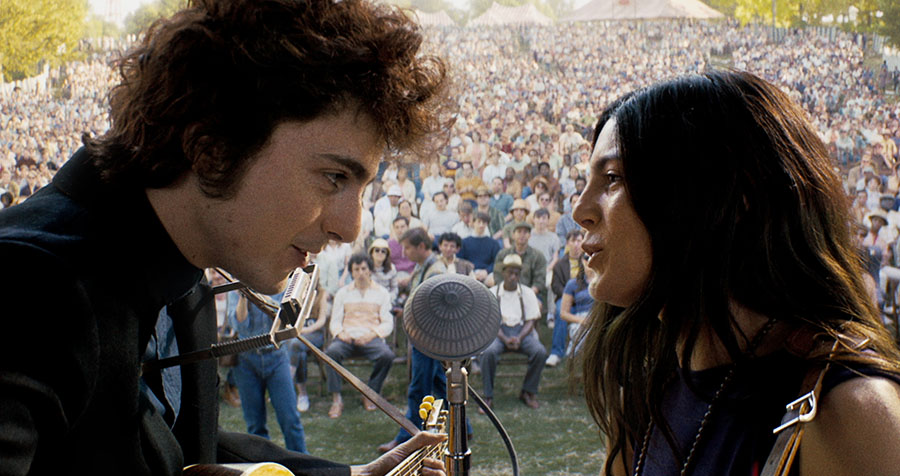 The sound team went to incredible lengths to properly simulate the folk music scene of the 1960s, including training the cast on their various instruments, combing antique shops and private collections for era-appropriate microphones, mixing boards, and amplifiers, and scouting locations and building sets with the proper acoustics to make each song feel like its own actual concert. Because yes, these actors are indeed singing live on set, which means that the extras playing the audience on screen actually have to hear them just as well as the audience in the theatre. Nothing is mimed here. Timothée Chalamet is really playing a guitar and harmonica, Ed Norton is really playing banjo, and the backup band is really a backup band. Not only does this require an insane amount of skill by the actors to learn these instruments, but every scene has to be precisely mic-ed up so that the sound comes through clearly as the shots are filmed.