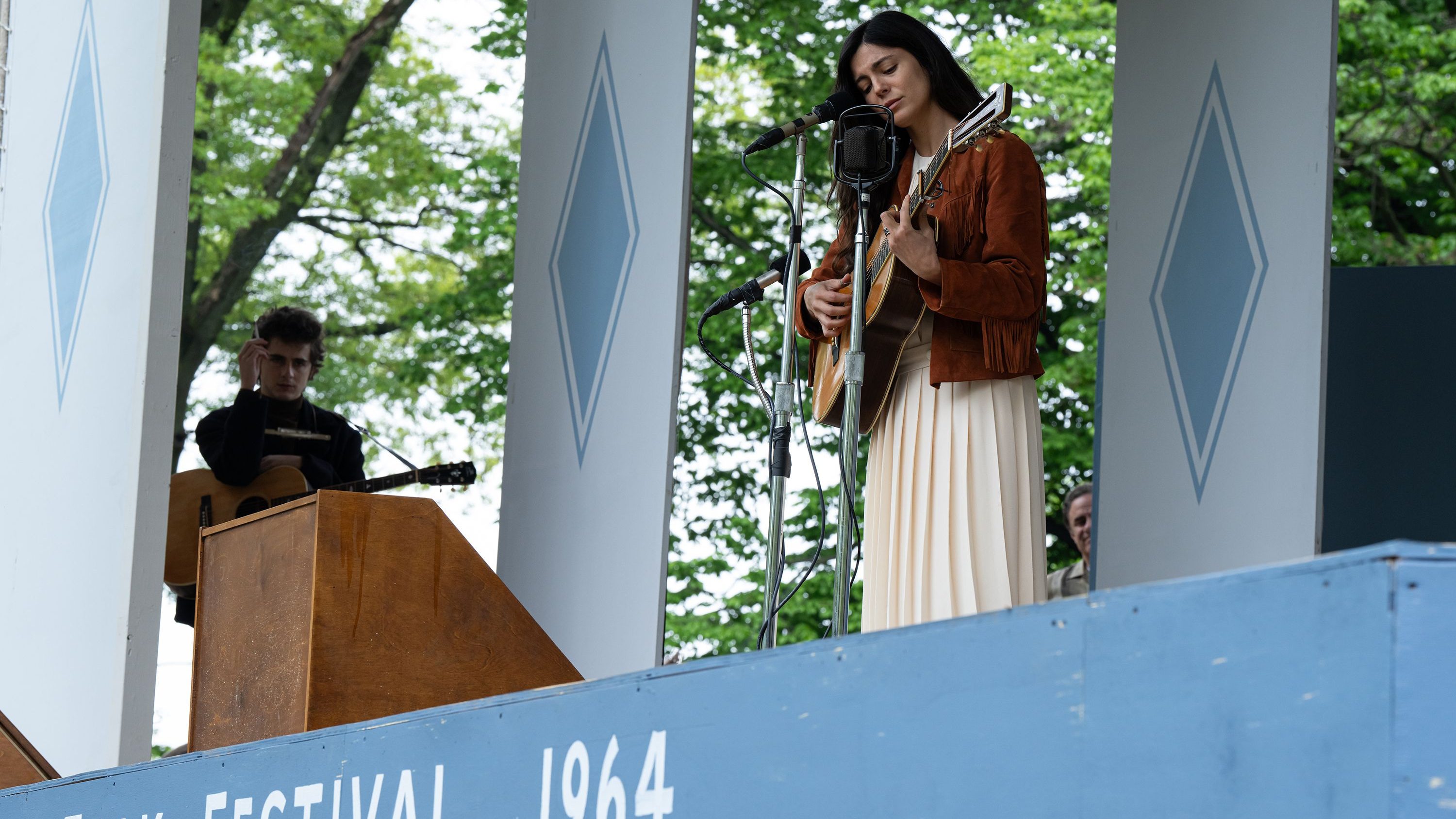 From the moment we first meet her, arguing with Albert Grossman about loyalty to her smaller label, we see how much she cares about artistic integrity. She won’t abandon those who helped her make a name for herself, and when Bob gives her a backhanded compliment from the microphone after her set, she sees him as both an obstacle and a challenge. She understands that her looks contribute to her public profile, same as it does for Dylan, but she dedicates herself to overcoming such perceptions, while Bob sometimes doesn’t seem to care. She both despises that ease and envies it.