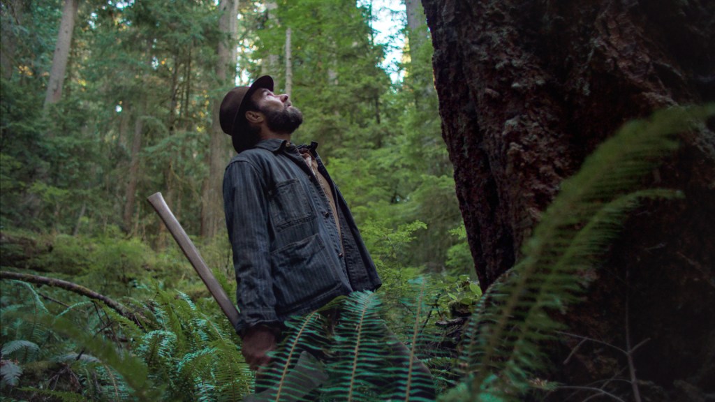On the one hand, given the tone poem framework of the film, there’s an emphasis on dreamlike imagery. We see that in the forms of the boots nailed to a tree to memorialize dead loggers, in the one-take where Robert is traumatized by seeing a migrant worker unceremoniously murdered by being tossed off the tracks and into a ravine, and then again when a vigilante just moseys into their camp and shoots one of his coworkers as revenge for an unseen crime. We see it in his literal dreams about his wife and daughter, reminiscing and mourning as he fights through imaginary flames and his own demons. We see it in the final scene of Robert simply grinning as he takes in his first and only flight. We see it in the brilliant shot where the camera is mounted on a tree facing upward, so that we get a POV perspective of it being felled.
